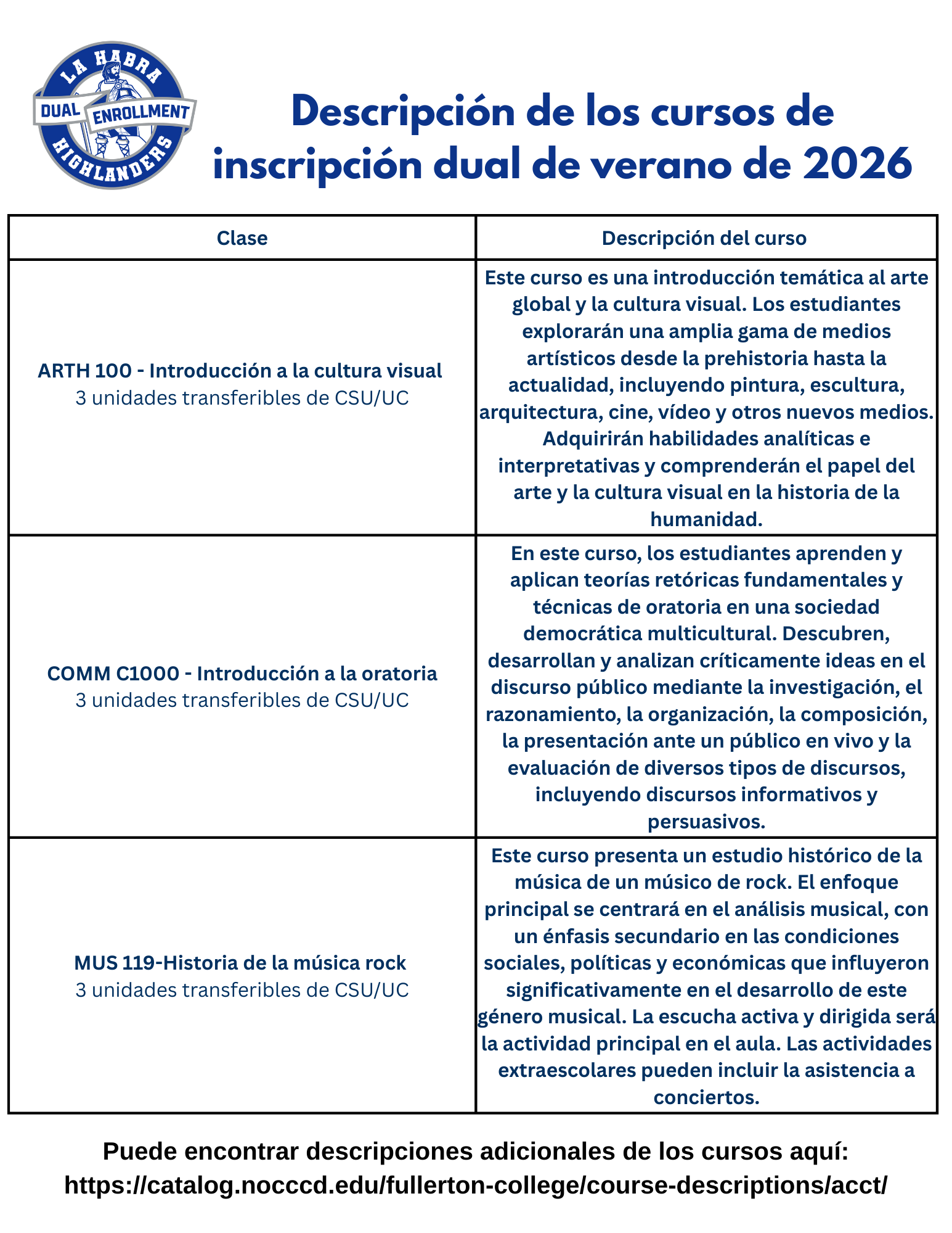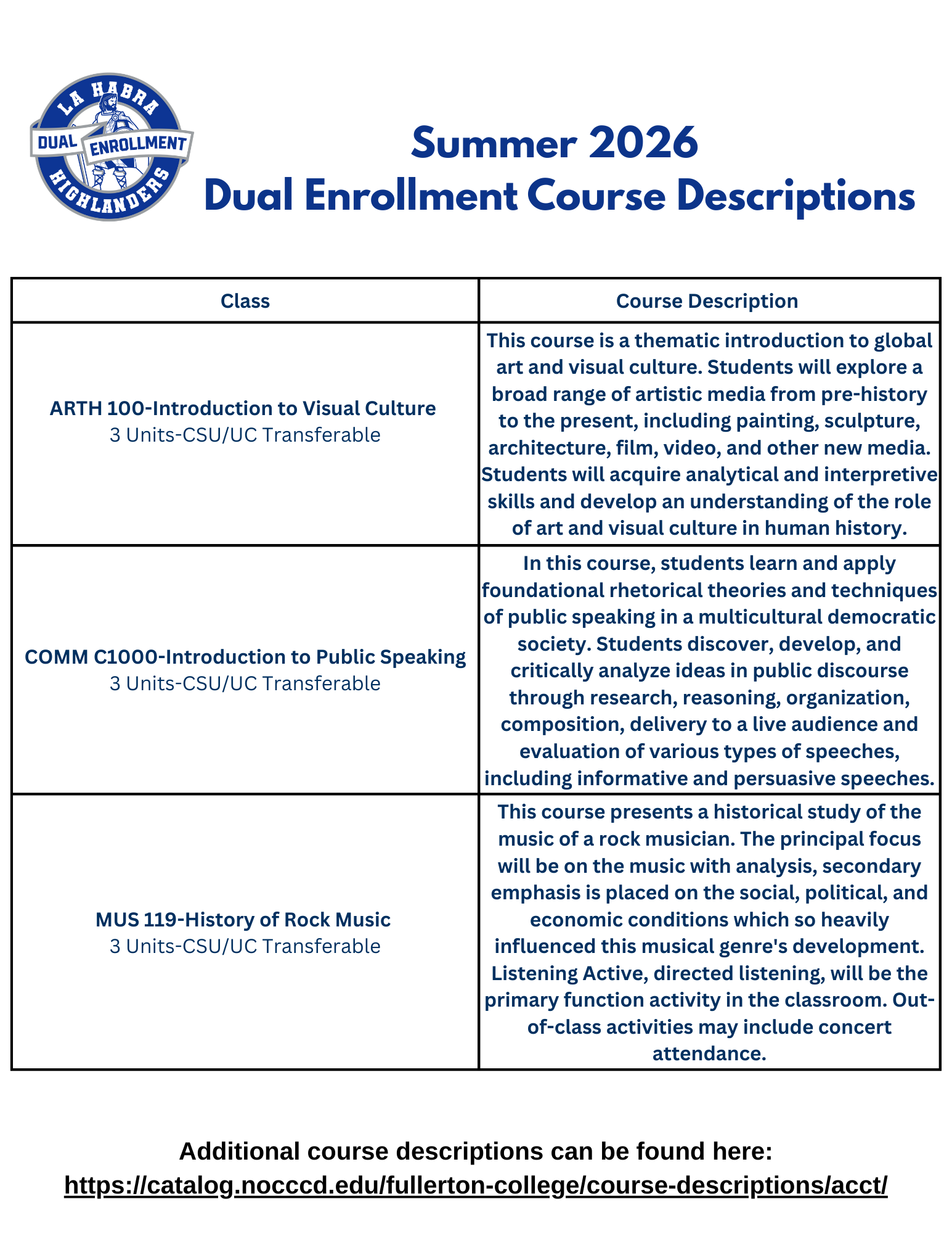 We are excited to share our dual enrollment classes flyer for the Summer 2026 term in partnership with Fullerton College! Dual enrollment allows high school students to take college-level courses, earning credits that count towards most CSU and UC schools. This is a fantastic way for students to challenge themselves academically, explore potential career paths, and save on future college tuition costs. We encourage you to review the flyer with your student and discuss which classes align with their interests and goals.