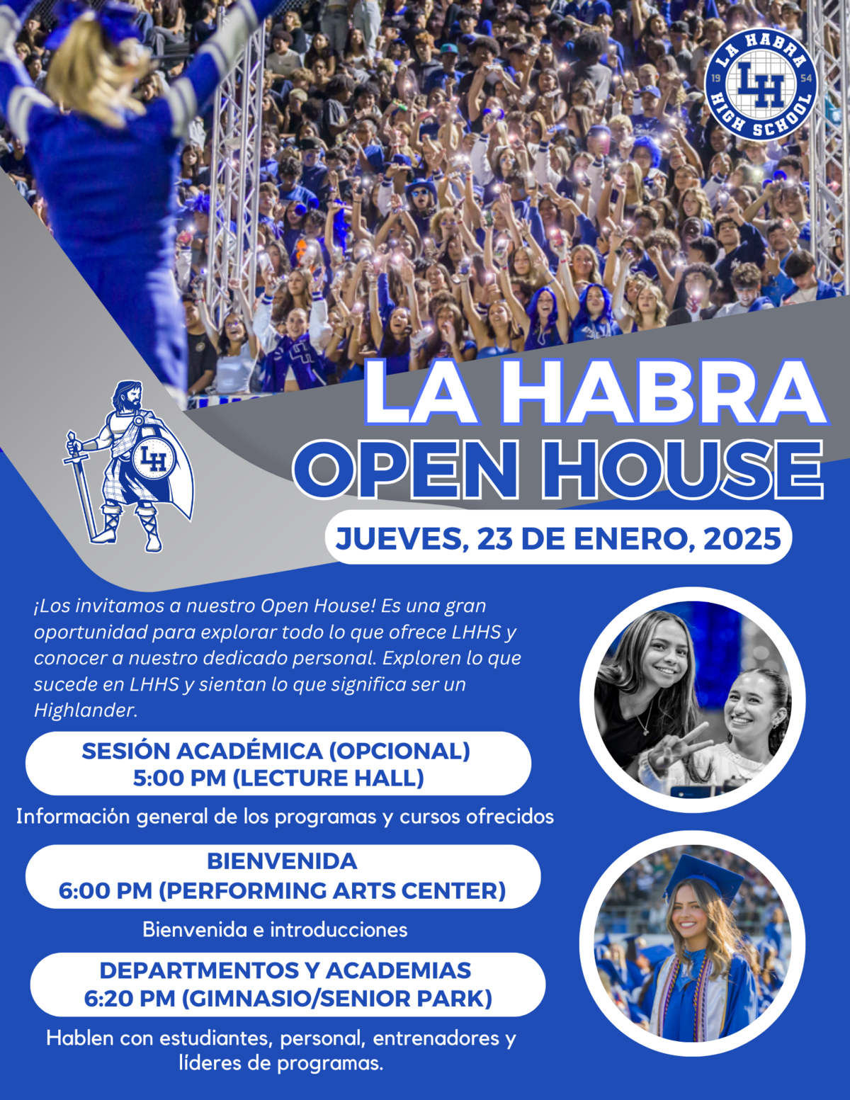 Is your student an incoming 9th grader for the 2026-2027 school year? Come join us on January 22nd starting at 5pm to learn about the culutre of La Habra High School and to find your place on our campus.